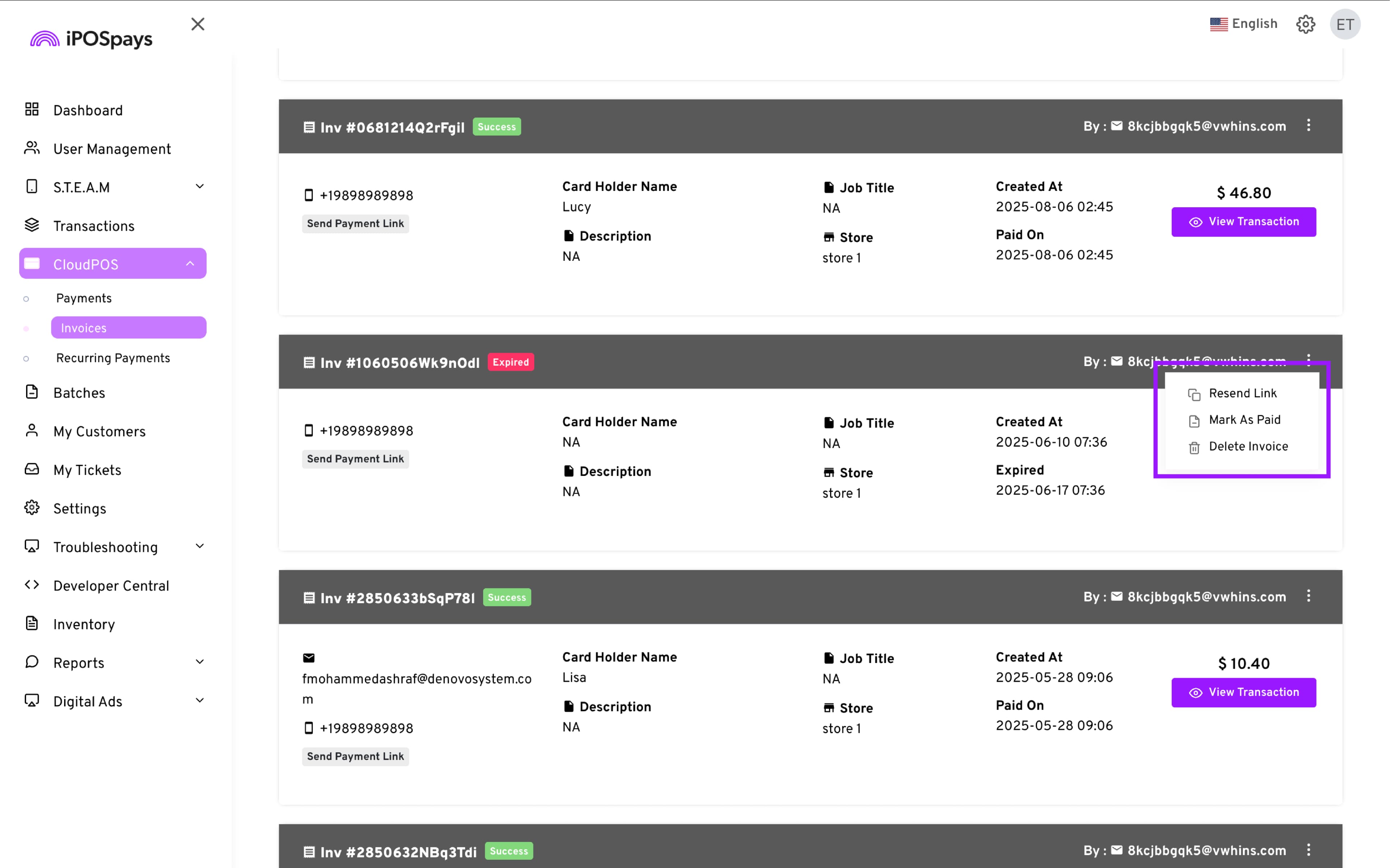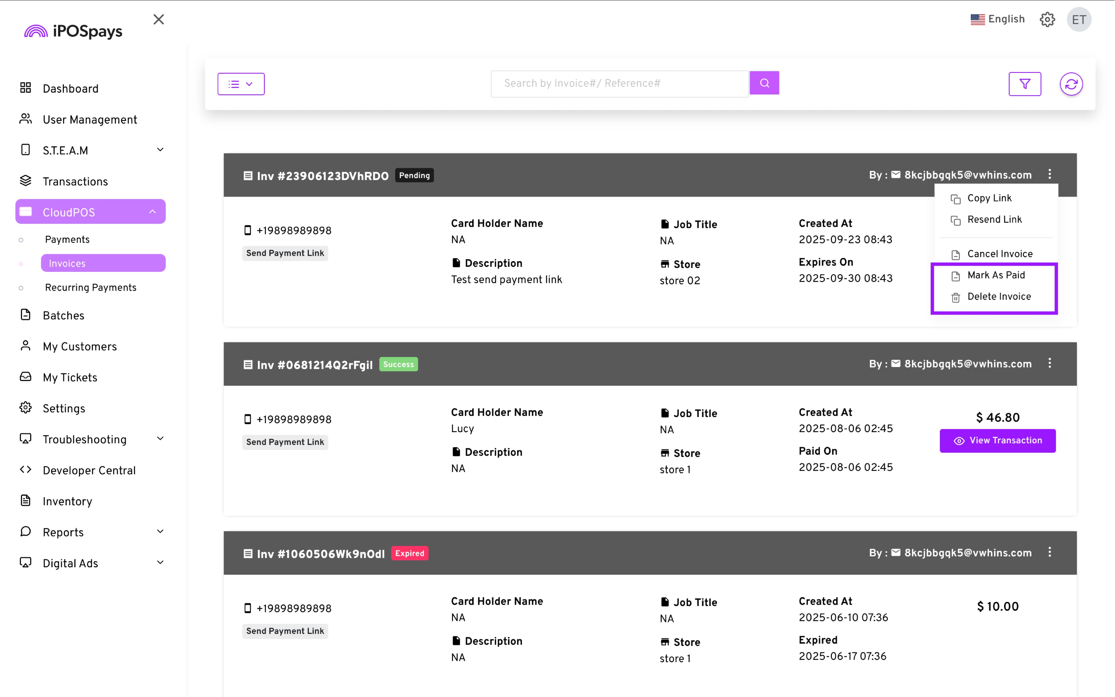 This update introduces new actions for managing invoices for merchant accounts on iPOSpays. Users now have more flexibility when handling expired and pending invoices.