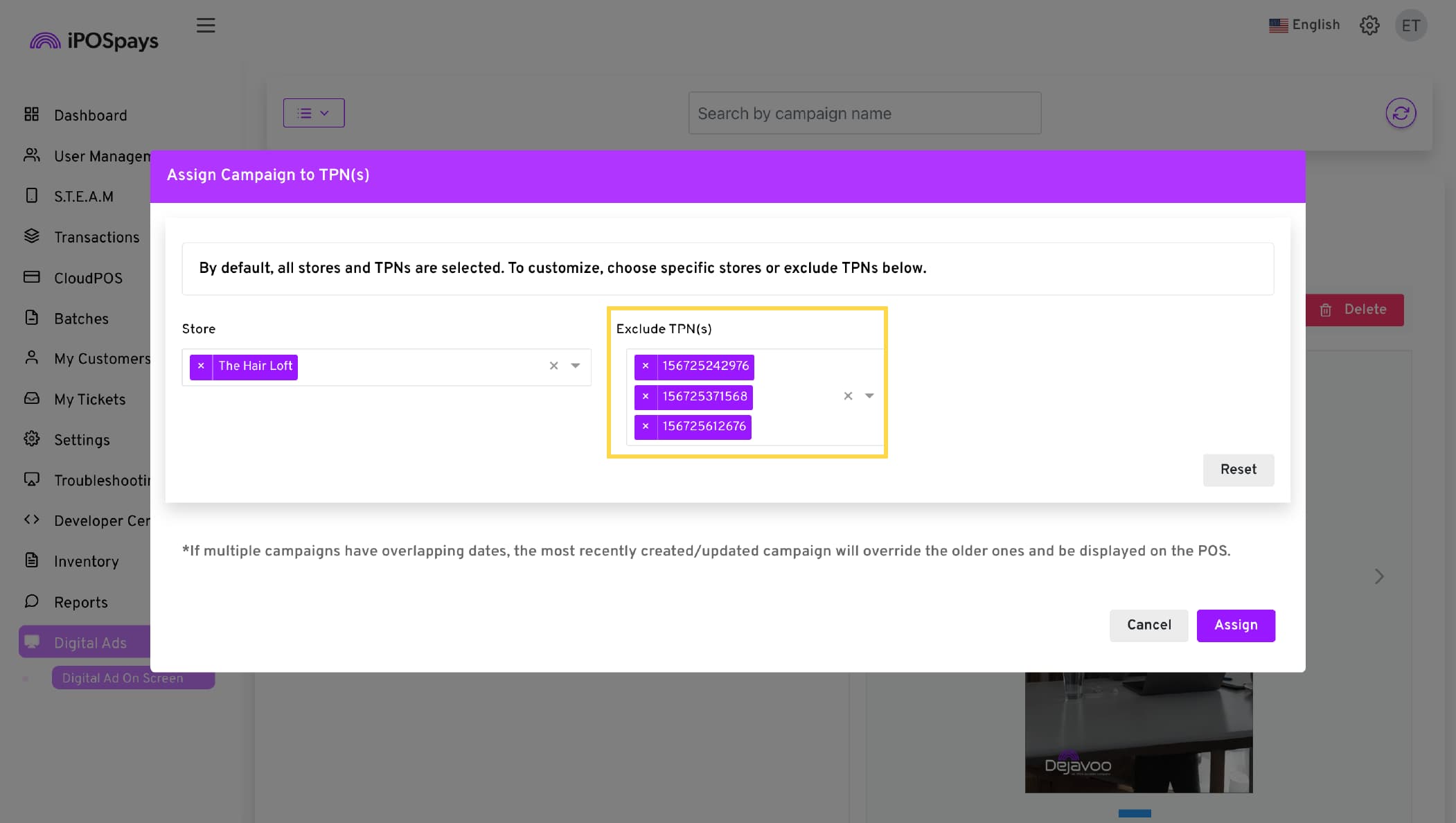 - Assigning the ad to a store will automatically apply it to all TPNs under that store. If you want to prevent certain TPNs from displaying the digital ad, you can manually search for them and exclude them.