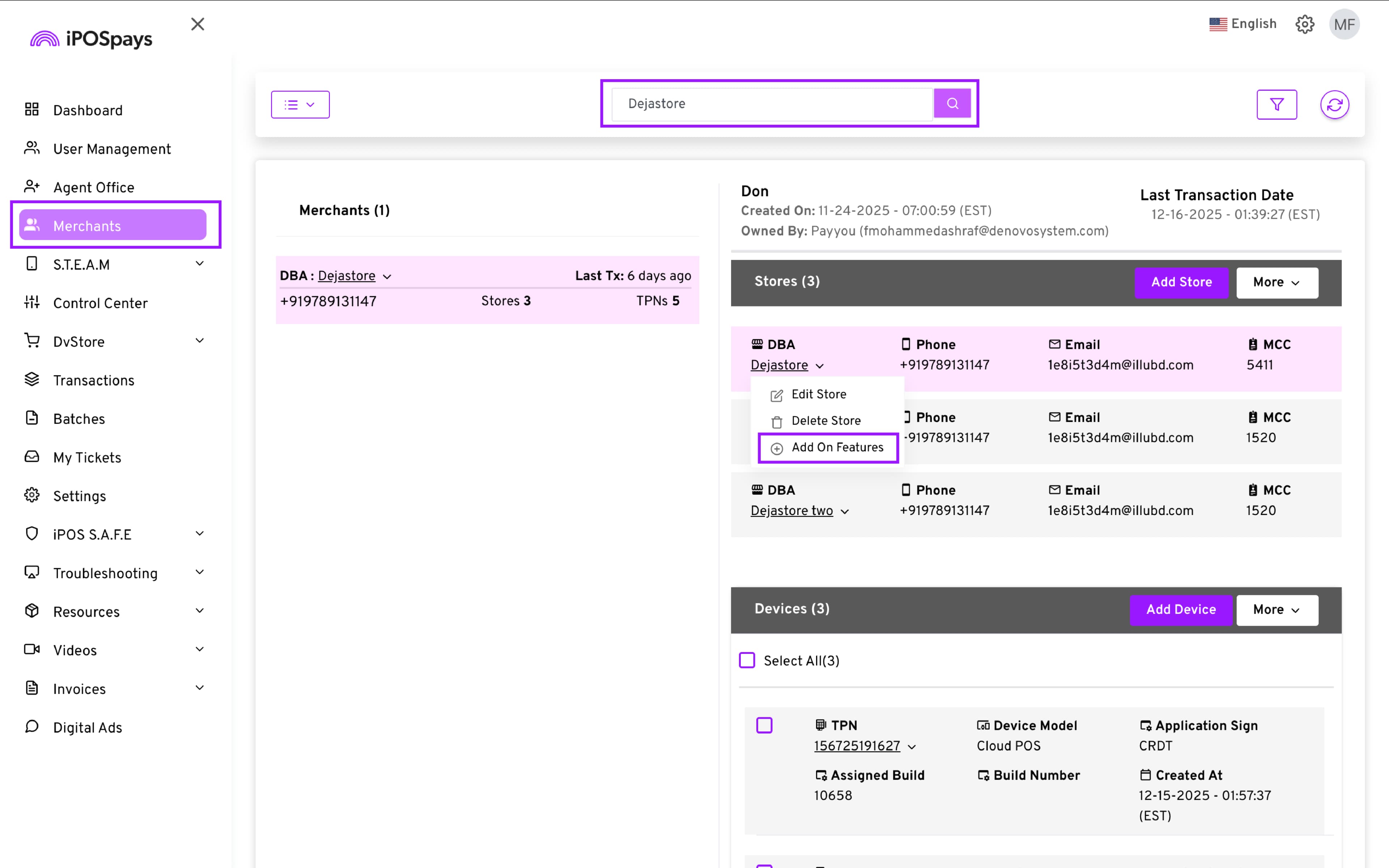 Go to Merchants → Search and select the merchant → Store DBA → Add-On Features.