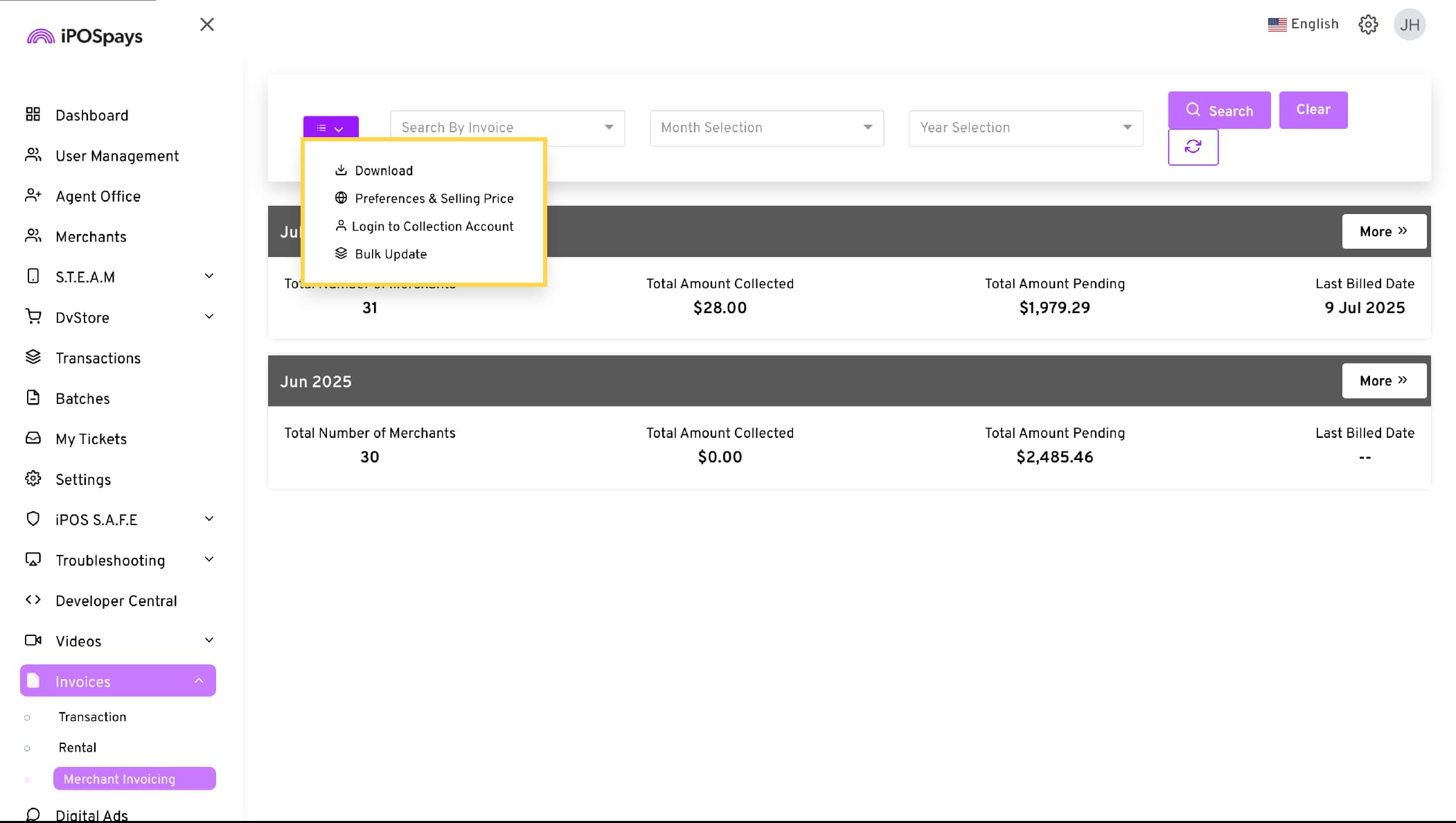 Before you begin: If you do not see Merchant Invoicing under Invoices in your ISO account sidebar, it means this feature has not been activated for your account. Contact your Dejavoo representative to get it enabled.